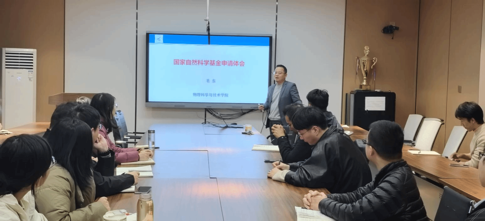 在理学院楼454会议室召开2026年度国家自然科学基金申报动员会,特别邀请国家自然科学基金青年B类项目获得者毛东教授作申报指导与经验分享。会议由副院长尹剑波教授主持。